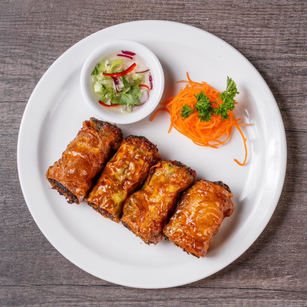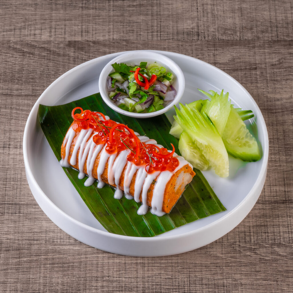 Fried crispy skin tofu rolled with shrimp, carrot, chilli, betel leaf and served with Arjard sauce.