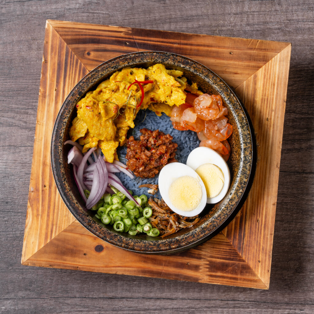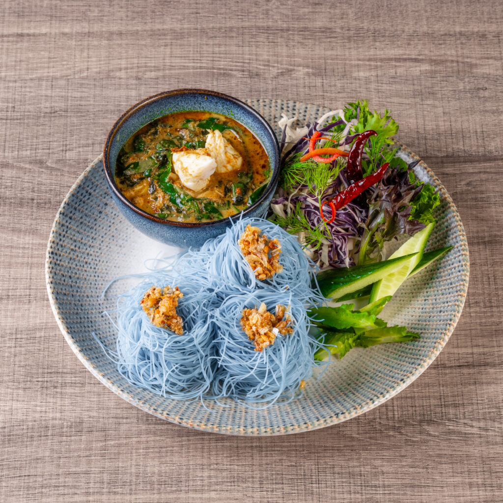 The unique local dish from Songkhla province. Dried chicken curry with coconut rice (butterfly pea flower) and topped with shrimps, dry fish Anchovies, egg, onion, long bean and homemade chilli tamarind paste.
