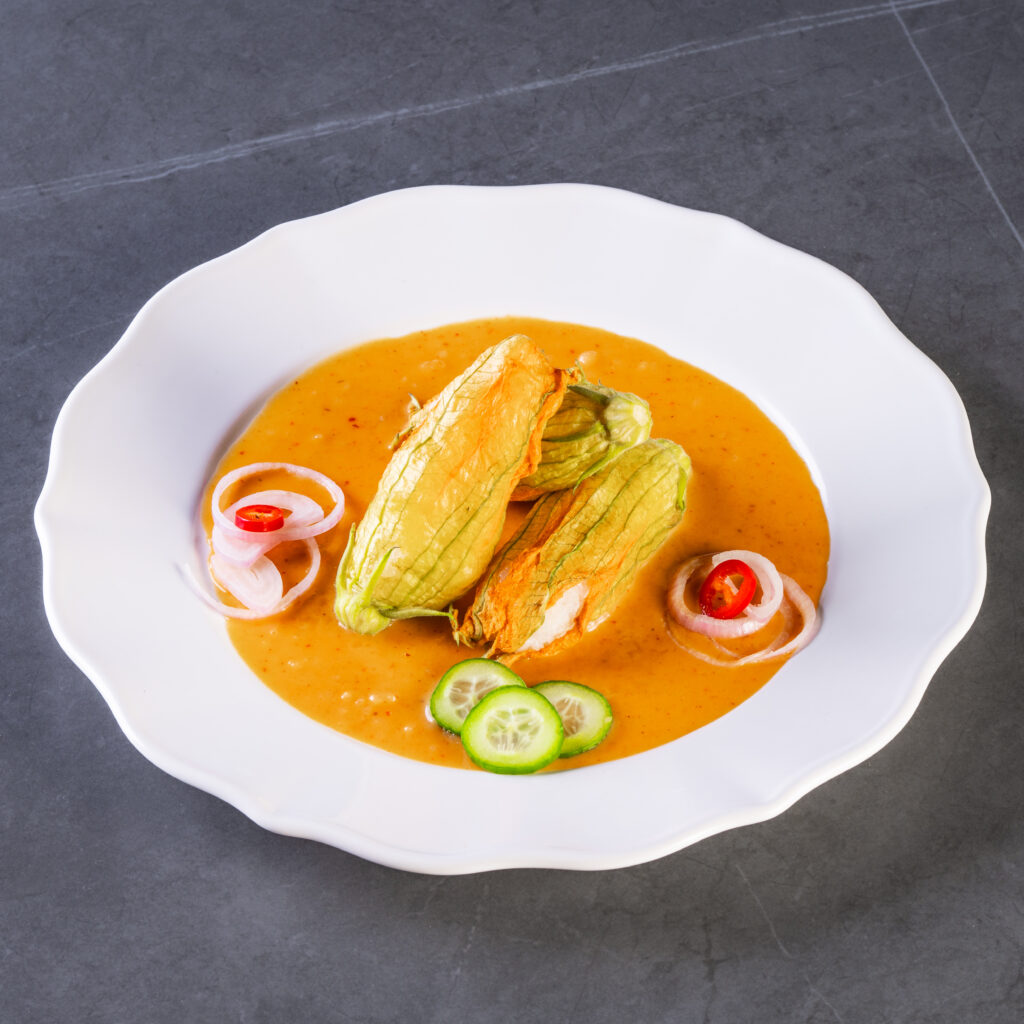 Coconut sticky rice, zucchini blossom, peanut sauce, pickles