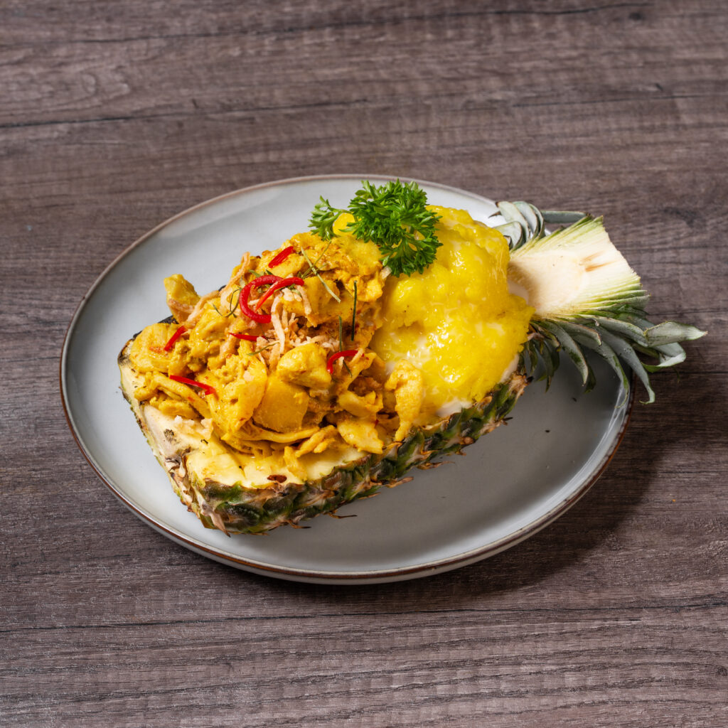 Stir-Fried Pineapple curry chicken, Served with coconut curry sticky rice.