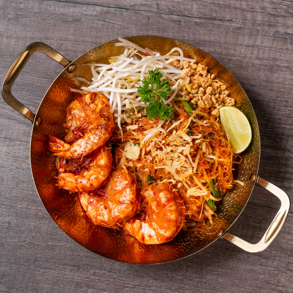 Southern Thai Style Pad Thai, with vermicelli, shrimp paste, chilli, bean sprouts, chive, onion, peanut shrimps