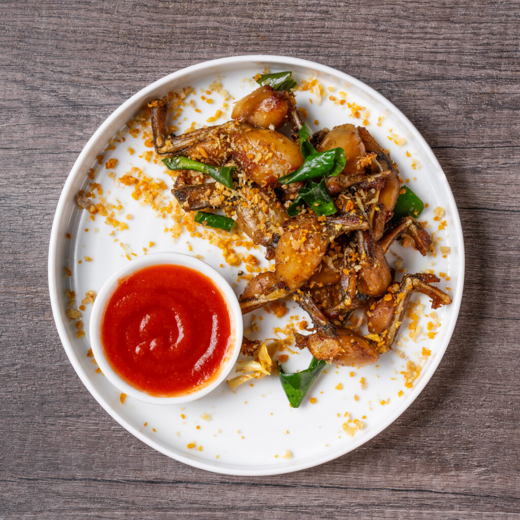 Deep fried frog legs with turmeric root, fresh garlic and serve with chilli sauce